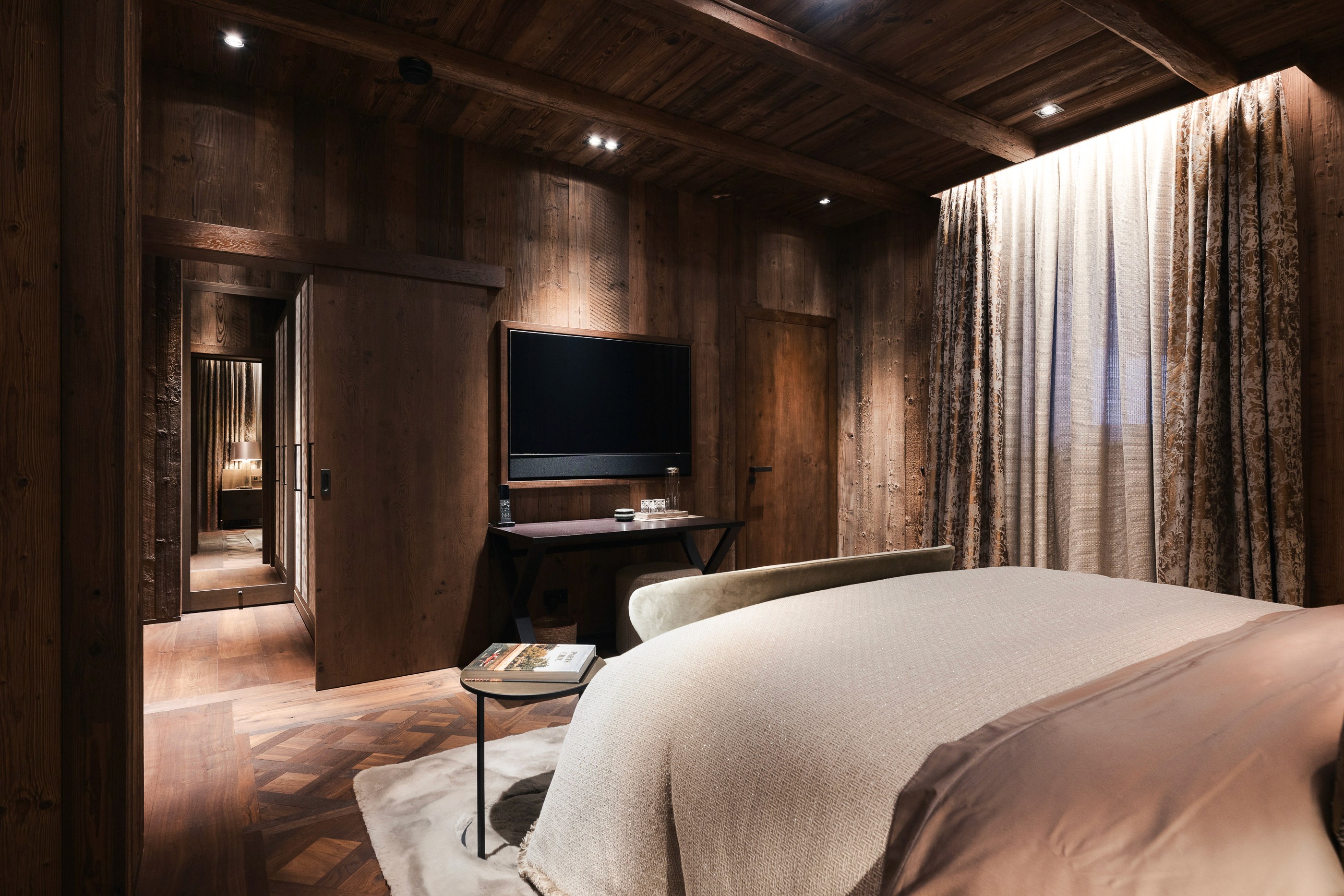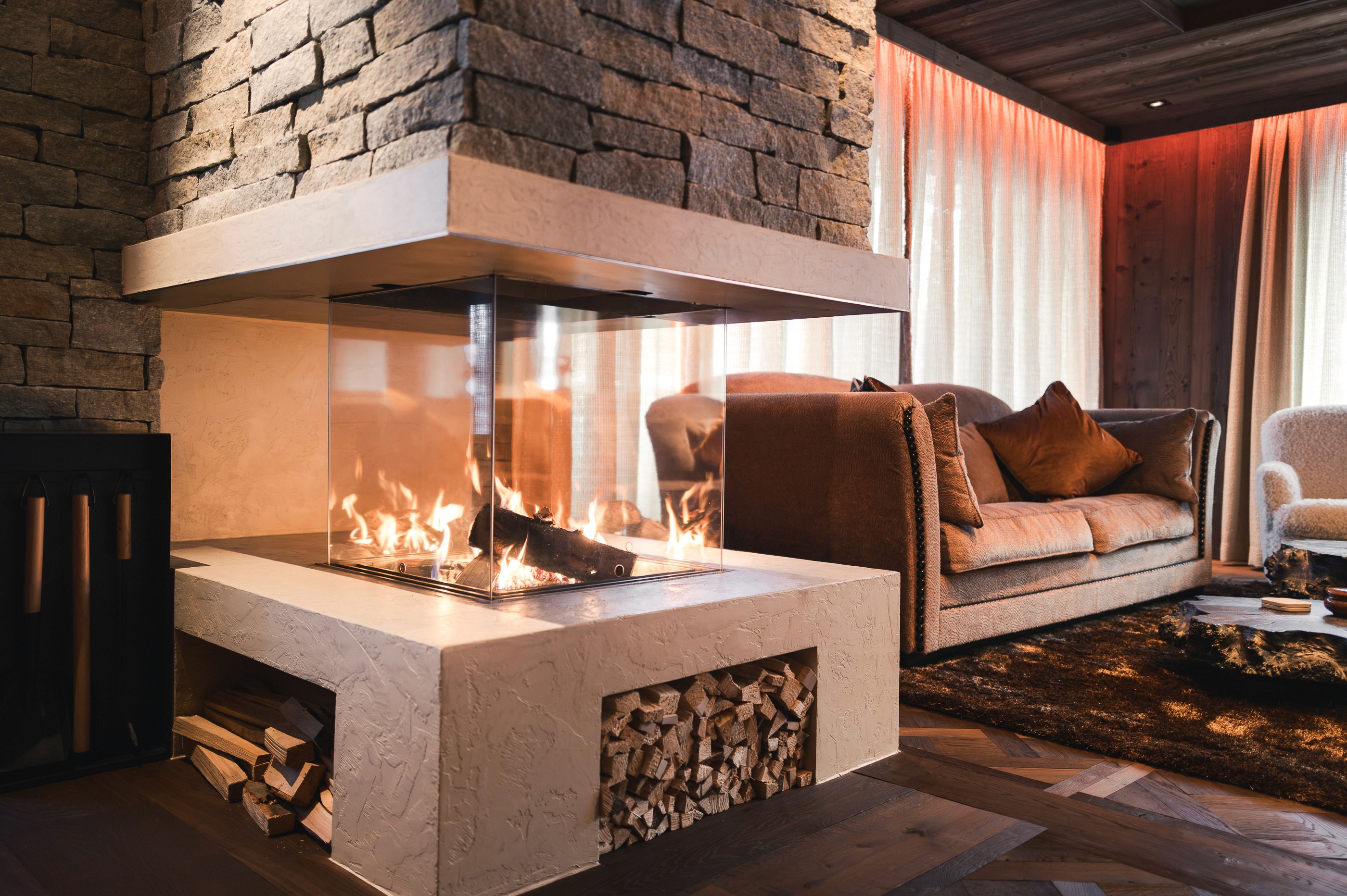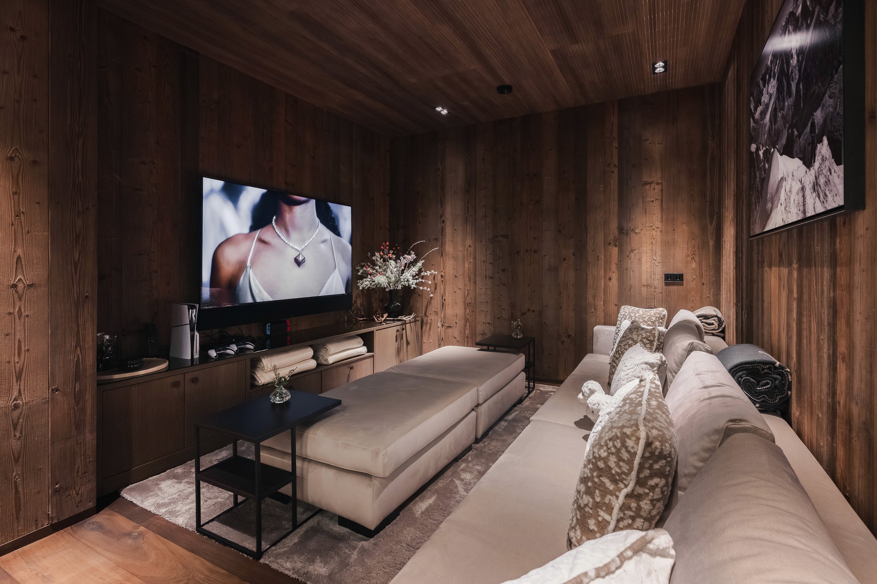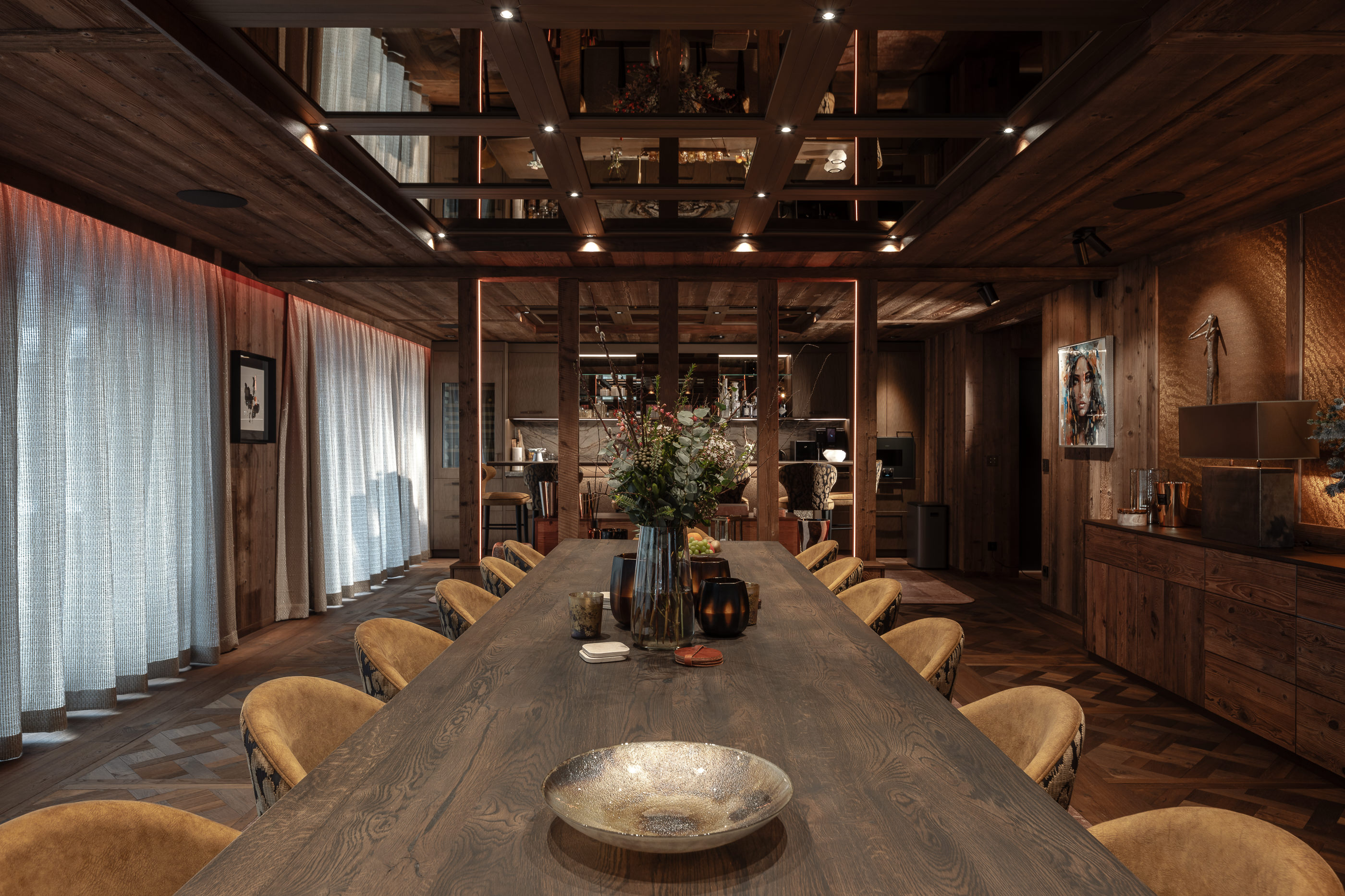 The chalet’s heart is the expansive living area with an open fireplace and two lounge spaces — perfect for both quiet mornings and shared evenings. A sophisticated dining area invites long meals, while the open kitchen with bar is ideal for private après-ski gatherings or curated culinary experiences.